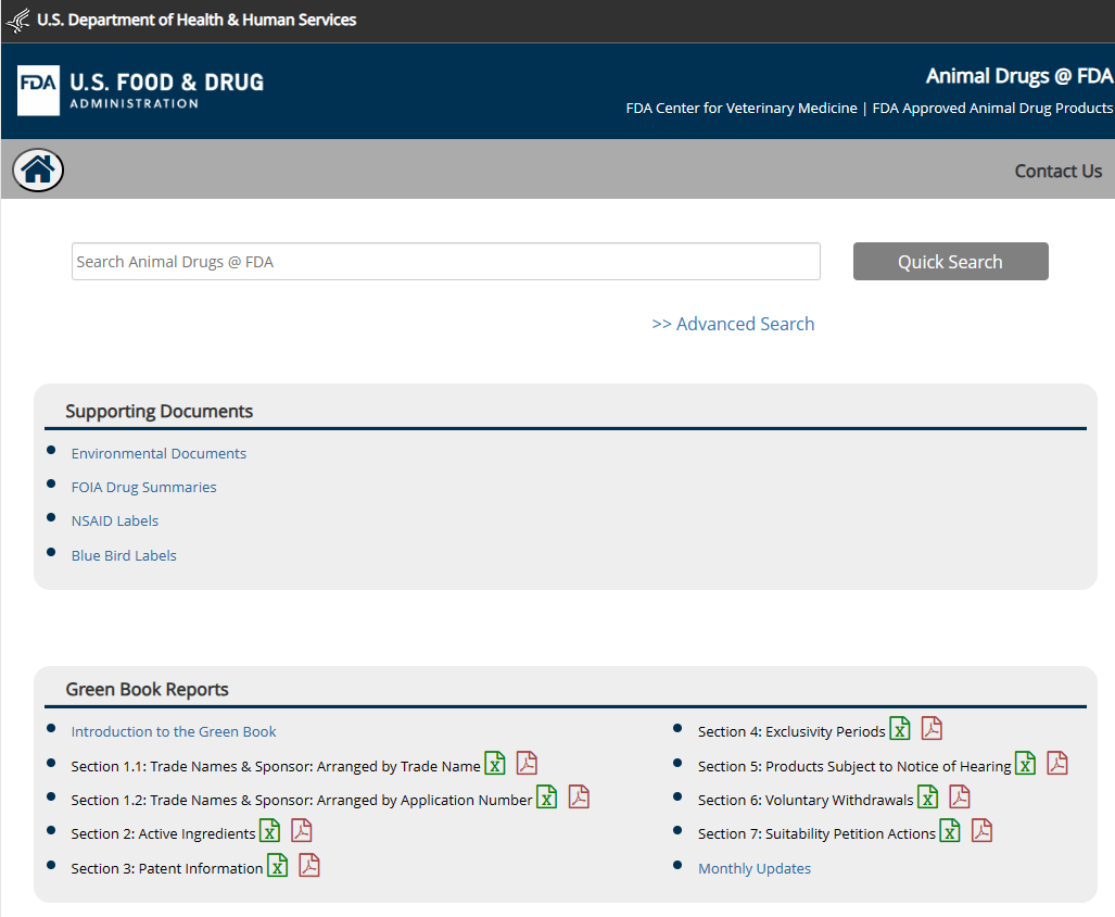 美国食品与药物管理局(FDA)建立发布的动物药品数据库,支持查询所有FDA批准使用的动物药品信息。可通过名称进行快速检索,也可以通过赞助商名称、申请状态、专有名称、成分、剂型、路线、物种等进行高级搜索。
