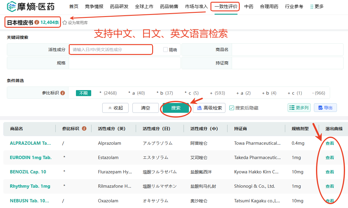 国家药监局官网整合了日本橙皮书编译数据,支持中文检索,涵盖溶出方法、标准曲线及原料药理化性质,但数据截止2011年,这里就不详细介绍了。更多数据也可通过摩熵医药-日本橙皮书数据库来免费查询药品溶出数据,弥补缺失数据。