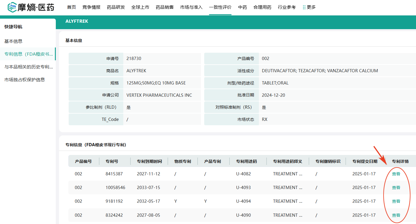 截至2025年,摩熵医药的【美国橙皮书】已收录四万余条数据。该数据库在FDA官网基础上,提供更全面的检索方式,支持精确查询和条件筛选。用户可通过输入药品名称、正文内容等方式,实现多维度检索。检索结果涵盖产品剂型、给药途径、注册审批号、批准日期、专利号、市场状态、是否为参比药物、是否为参比标准、专利独占许可信息等详细信息。