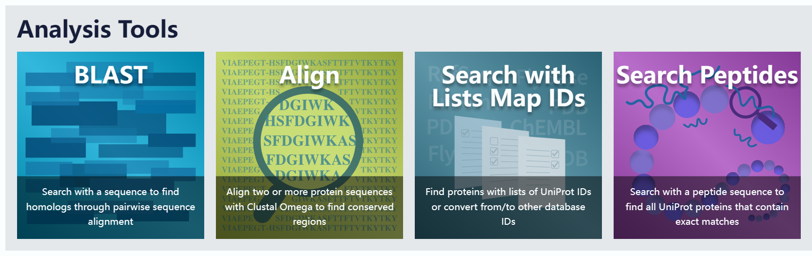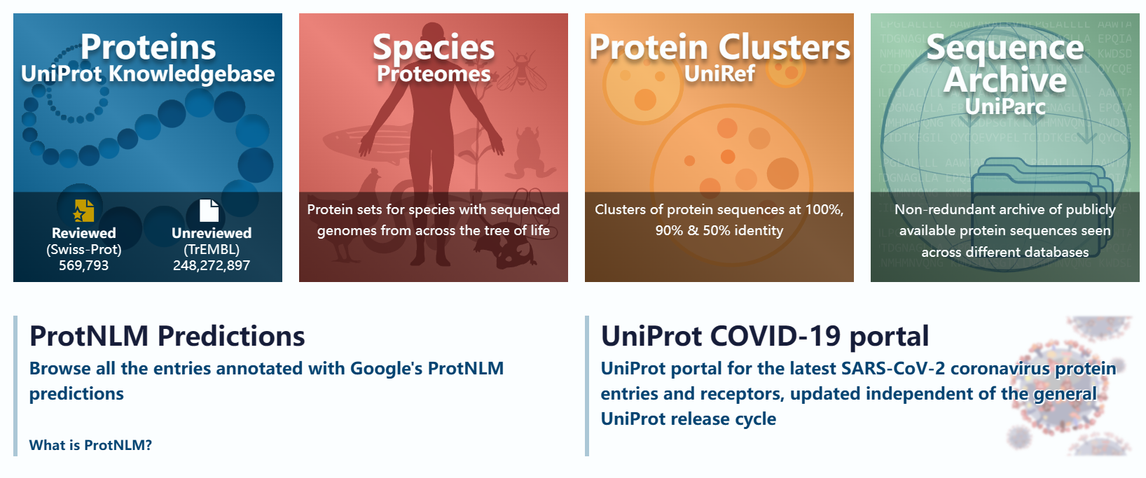 UniProt数据库,主要包括UniProtKB知识库、UniParc归档库、UniRef参考序列集、Proteomes蛋白组四部分。其中UniProtKB知识库是UniProt的核心,除蛋白质序列数据外,还包括大量注释信息。UniProtKB知识库分Swiss-Prot和TrEMBL两个子库。UniParc归档库将存放于不同数据库中的同一个蛋白质归并到一个记录中以避免冗余,并赋予序列唯一性特定标识符。UniRef参考序列集按相似性程度将UniProtKB和UniParc中的序列分为UniRef100、UniRef90和UniRef50三个数据集。Proteomes蛋白组是2011年新增加的数据库,主要是收集已经完成全基因组测序物种的核酸序列翻译所得的蛋白质序列。此外,UniProt数据库还包括文献引用(Literature Citations)、物种分类学来源(Taxonomy)、亚细胞定位(Subcellular Locations)、数据库交叉链接(Cross-reference Databases)、相关疾病(Diseases)和关键词(Keywords)等辅助数据。 这几部分内容在网站主页都有具体模块体现。