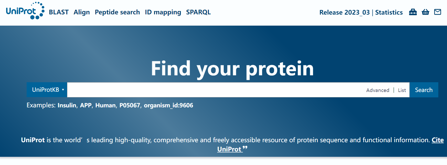 Uniprot数据库是资源最广、信息最丰富的蛋白质数据库,是查询蛋白功能的首选数据库。Uniprot数据库由Swiss-Prot、TrEMBL和PIR-PSD三大子数据库构成,数据主要来自于各物种基因组测序完成后得到的全基因蛋白质序列,并包含了很多来自文献中的蛋白及其功能信息。尤其是swiss-prot 子数据库,库中蛋白质信息都是手工核对过的 ,非冗余, 有详细注释信息的蛋白数据。
