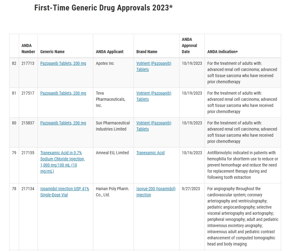FDA首次仿制药批准数据库可查询ANDA编号、通用名称、ANDA申请人、品牌、批准日期、ANDA适应症等相关数据。
