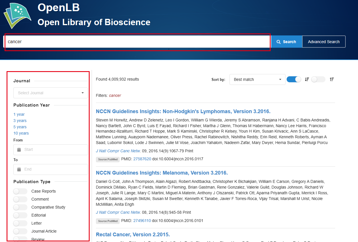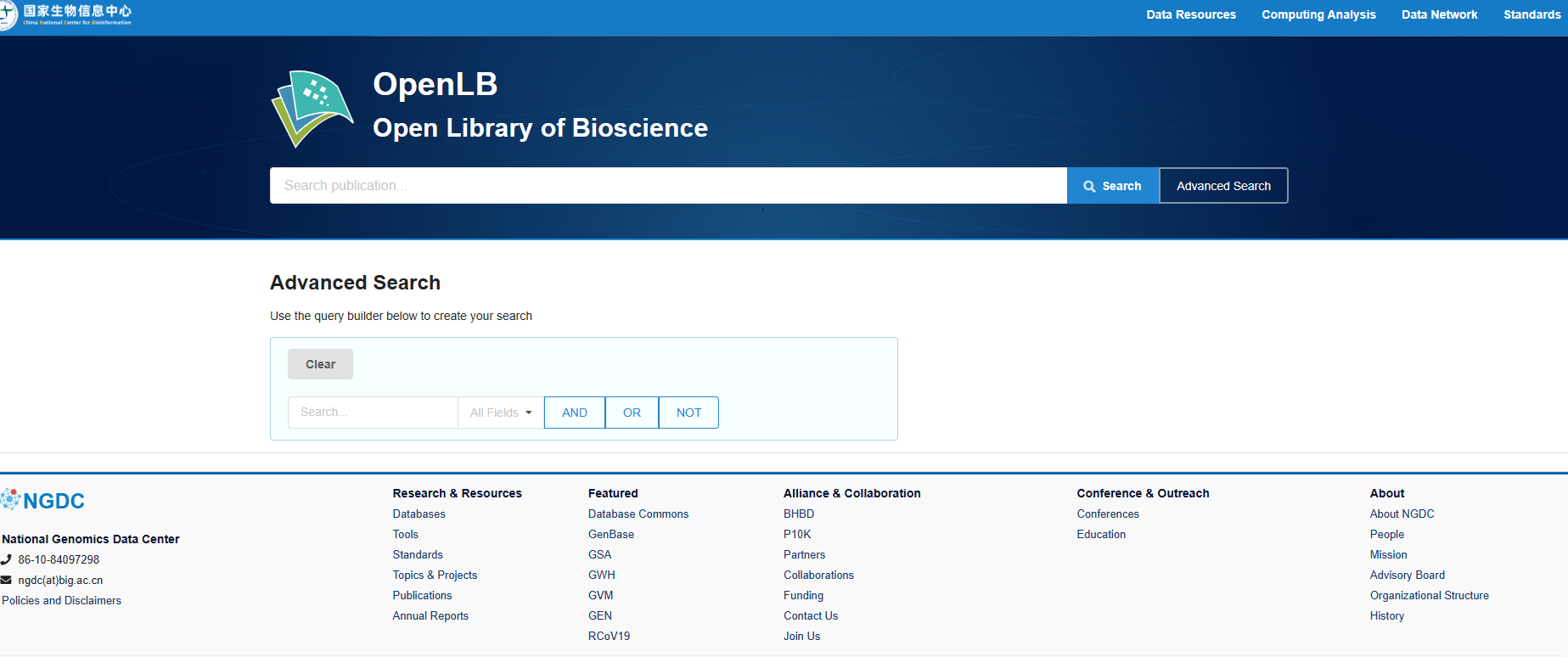 OpenLB开放生物科学图书馆提供对海量文献文本的开放访问,以及CNCB-NGDC相关资源的友好链接。OpenLB的文献文本来源于NCBI PubMed、bioRxiv和medRxiv,包括标题、摘要、作者、期刊、参考文献等。
