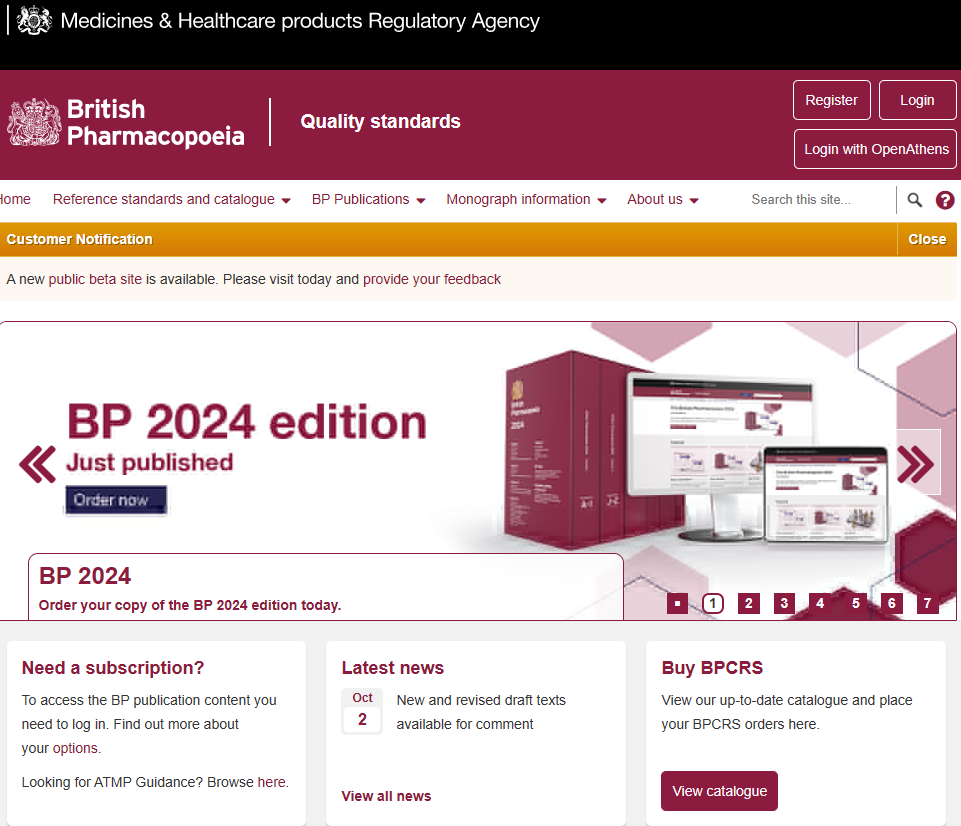 《英国药典》是英国药剂和药用物质的官方标准文集,具有法律地位,包括 BP(兽医)和欧洲药典 (Ph. Eur.)。其为英国药品和保健品监管局(MHRA)在保护公众健康方面的作用做出了重要贡献。