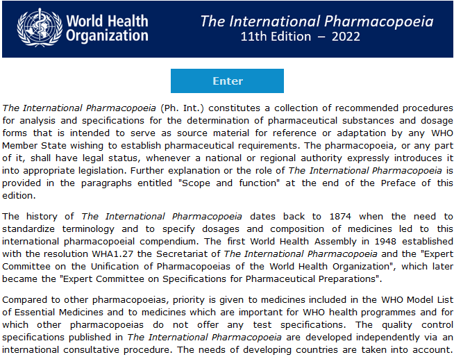 《国际药典》由世界卫生组织WHO编纂出版,其缩写为Ph.Int。《国际药典》是测定药物物质和剂型的推荐分析和规范的集合,旨在作为希望建立药品要求的任何世界卫生组织WHO成员国参考或改编的原始资料。
