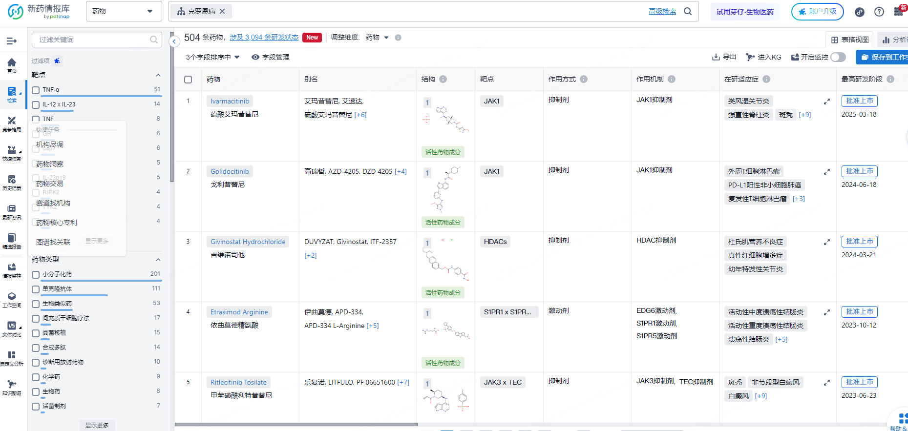 智慧芽新药情报库支持通过药物名称、药物类型、机构、靶点、作用机制、适应症、ATC分类、特殊审评、治疗领域、研发状态、国家/地区等多维度进行精准检索。