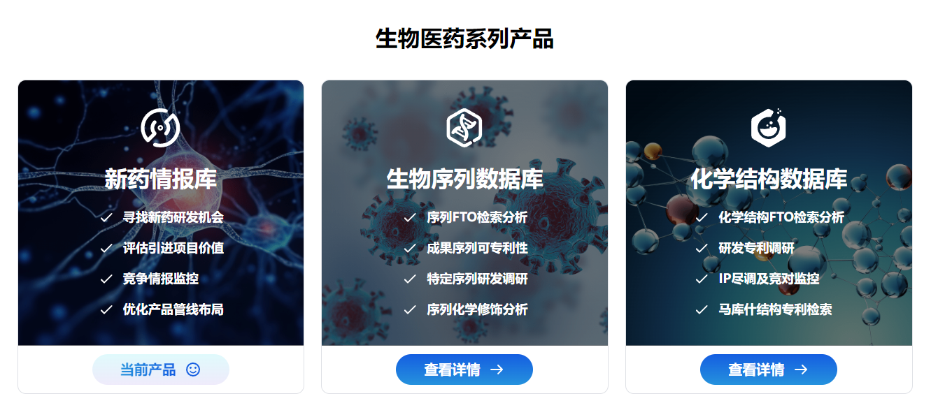 智慧芽旗下产品包括全球专利数据库、知识产权管理系统、研发情报库、新药情报库、生物序列数据库、化学结构数据库等。