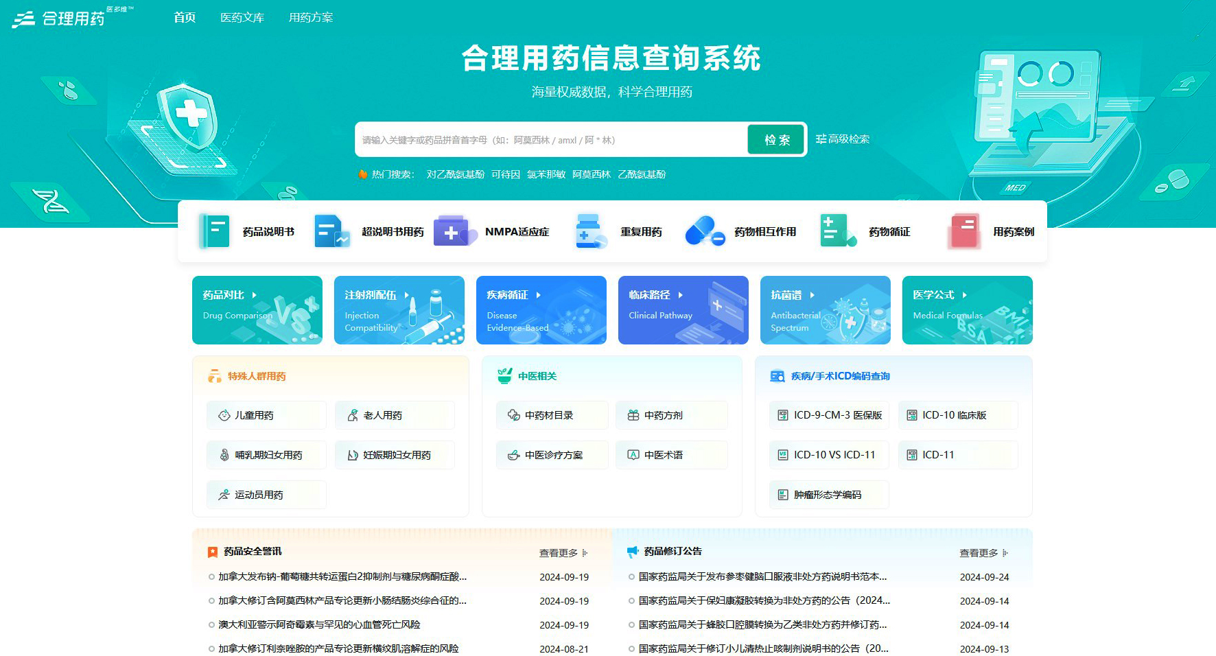 合理用药平台整合了海量的医药学大数据、循证医学和国家医疗政策等信息,以提供专业性、全面性和实用性的临床用药科学指导。它包括NMPA/FDA/EMA药品说明书、超说明书用药指导、药物全球安全警讯、高风险人群用药指导、药物循证文献、药物相互作用(DDI)、药物注射剂配伍等30+模块的专业数据。主要为医学院校学者、临床医护人员、政府机构等提供多维度的优质专业数据。