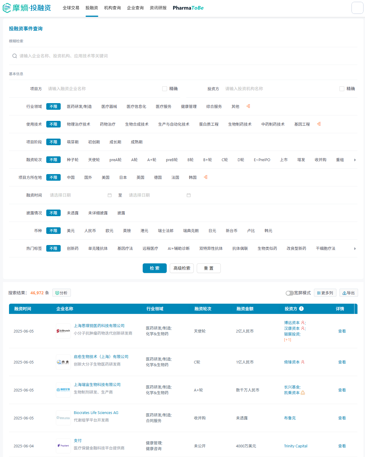摩熵医药投融资数据库PharmaToBe