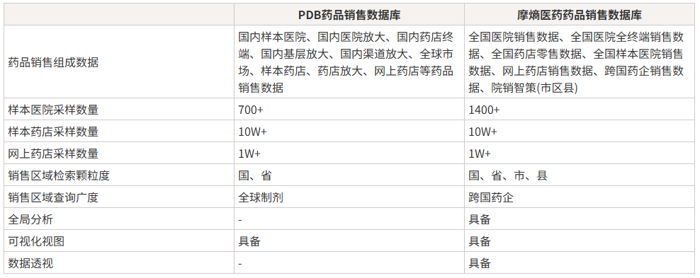 PDB销售数据库包含了国内医院终端(国内样本医院、国内医院放大)、国内全渠道放大市场、全球市场数据等药品销售数据。这些板块与摩熵医药销售板块比较相似,下面是笔者网上看到的PDB和摩熵医药关于药品销售数据对比信息图,供大家参阅: