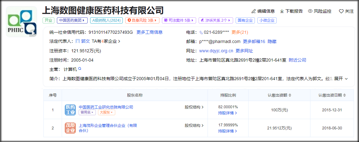 上海数图健康医药科技有限公司作为中国医药工业信息中心的运营实体,其主要股东为中国医药工业研究总院有限公司(持股82%)和上海茂形企业管理合伙企业(有限合伙)(持股18%),一共构建了信息数据、咨询服务和媒体会议三个平台。