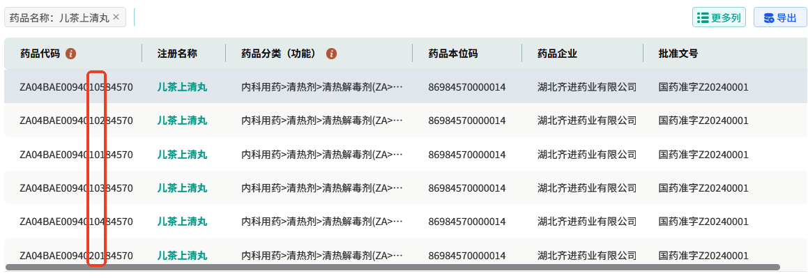 注意:不是所有医保药品编码都是23位,例如搜索中成药“茶上清丸”,结果如下图,可以看到其医保药品编码只有20位。