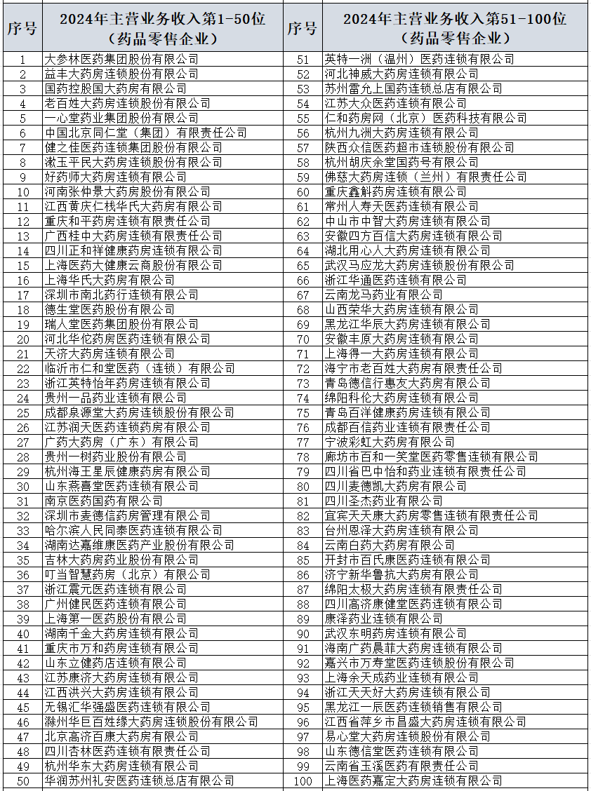 2025年8月28日,中国医药商业协会发布一年一度的《2024年药品流通行业统计分析报告》,公布了2024年主营业务收入Top100的药品批发企业以及Top100的药品零售企业。