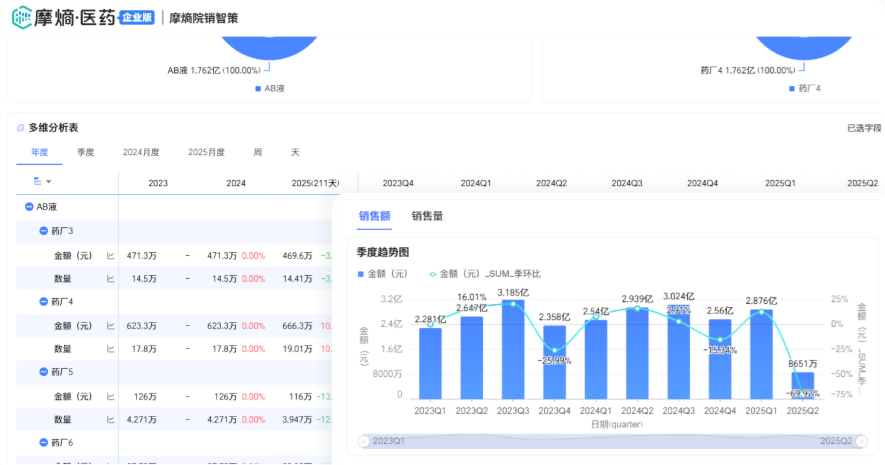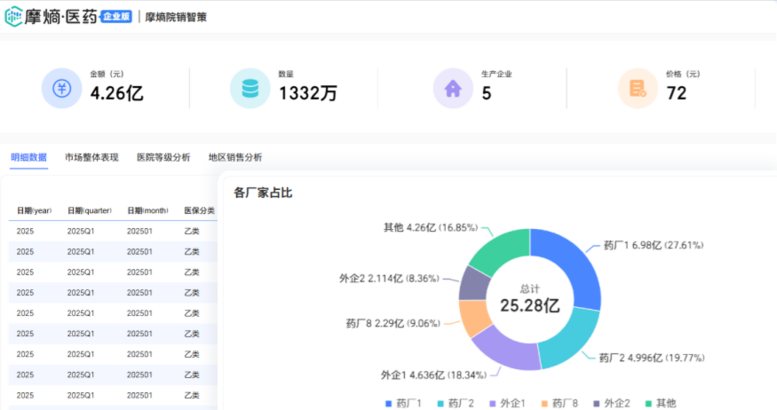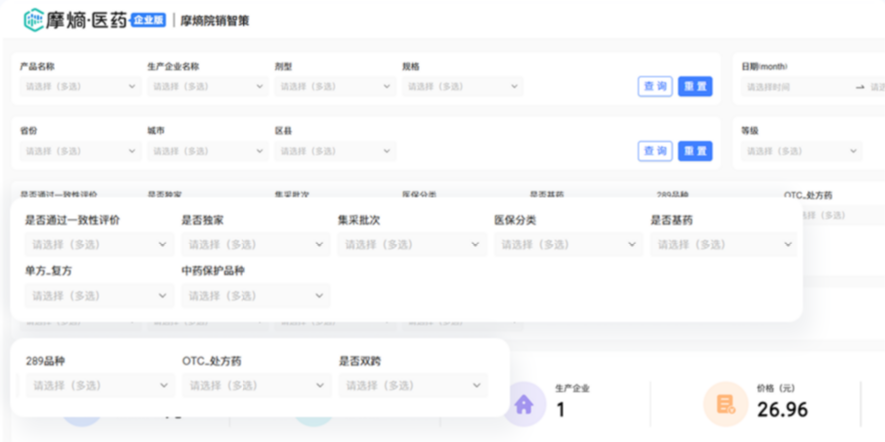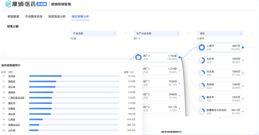 摩熵·院销智策是首款精细至全国各省、市、区县及医院等级维度的院内药品销售数据分析系统。