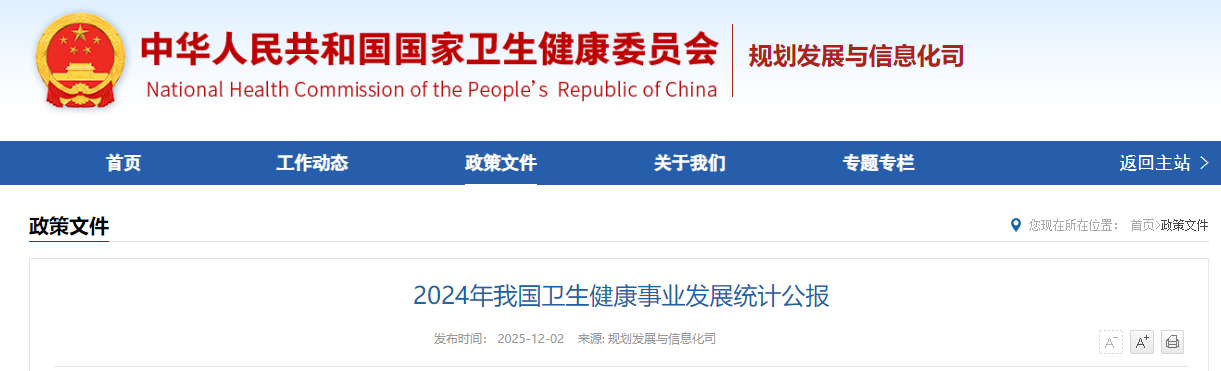 2025年12月2日,国家卫生健康委发布了《2024年我国卫生健康事业发展统计公报》,公报统计数据包含了人均寿命、孕产妇死亡率、医疗机构数量、卫生从业人员数量、就诊人次数量、医疗控费、社会卫生支出费用等详细数据变化。