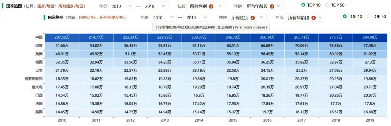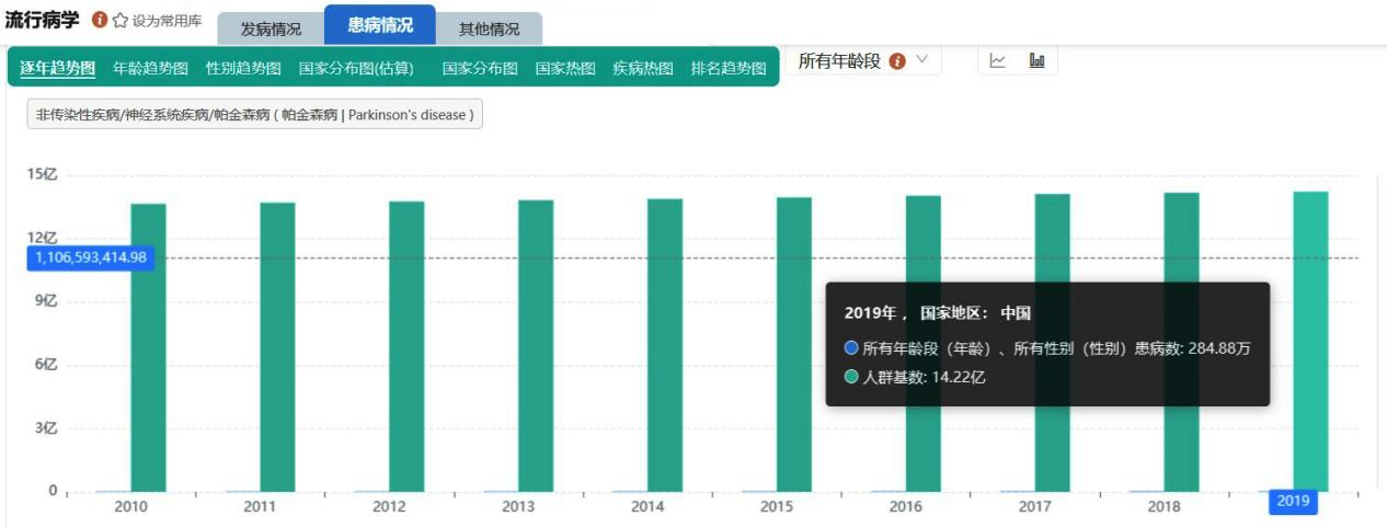 在“患病情况”数据模块中,若选择中国全人群作为筛选条件,可查询到2019年帕金森病患病人数为284.44万,而2018年该数据为275.1万。