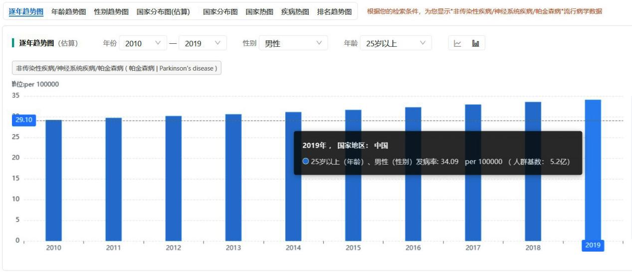 以帕金森病为例,笔者设定搜索条件为:地区选择“中国”,时间范围限定为“2010-2019年”,性别筛选为“男性”,年龄段聚焦“25岁以上人群”。通过下面所示的搜索结果页面(图标分析-逐年趋势图)可见,符合上述条件的人群发病率呈现逐年递增态势。数据显示,2019年该人群规模达5.2亿人,其中每十万人中超过34人发病,据此推算,2019年该人群实际发病数约为17.74万人。