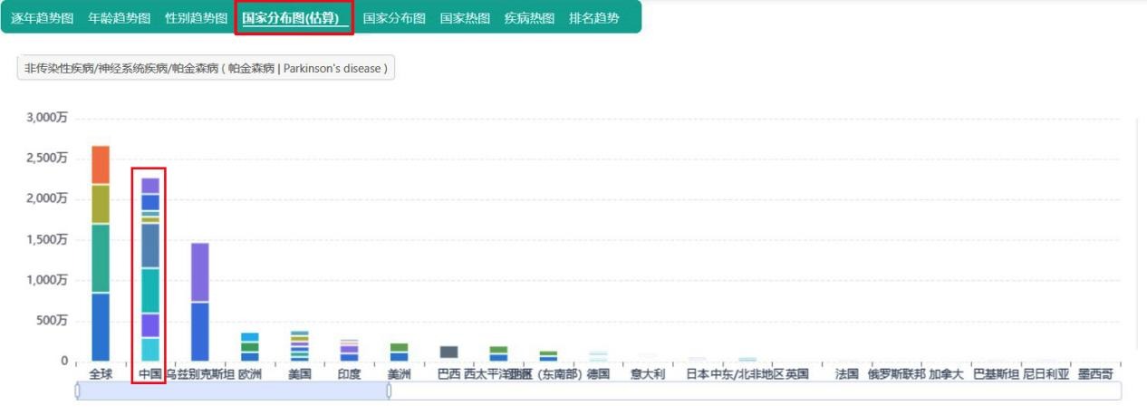 在国家热图数据分析界面中,大家可直观查看各国历年帕金森病患病人数的动态变化;同时,通过切换至国家分布图(估算)视图,能以柱状图或折线图形式更清晰地呈现数据分布趋势,便于进行对比分析。