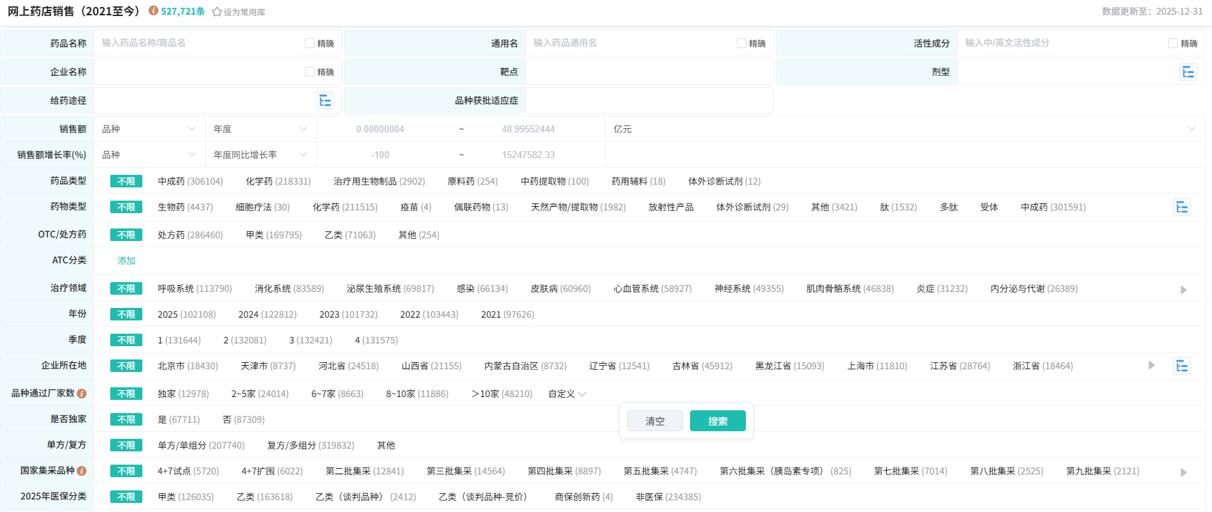 在数据查询与范围上,该库包含了化学药与生物药涵盖14个大类、90个亚类、2000+个通用名品种,中成药覆盖13个大类、4000+个通用名品种,品类丰富,结构完整。数据库支持多维度灵活查询,可通过药品名称、生产企业、ATC分类、剂型、用药途径、年份等条件自由组合筛选,也开放了网上药店销售数据API接口,满足多样化分析需求。
