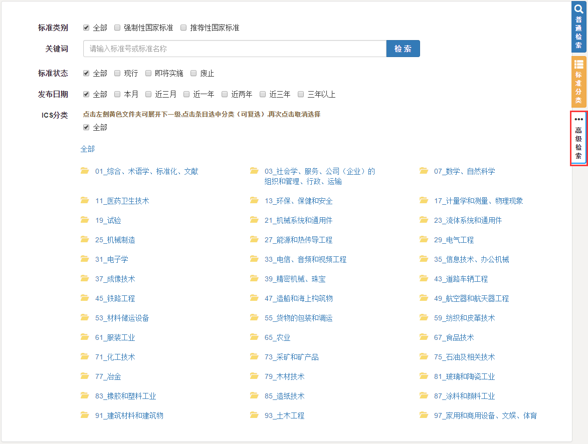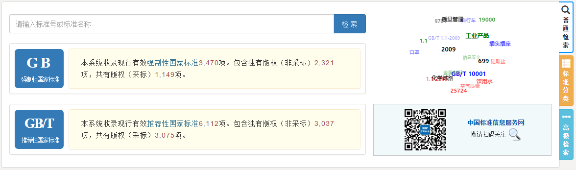 在首页右侧选择标准分类标签,点击相应标准分类