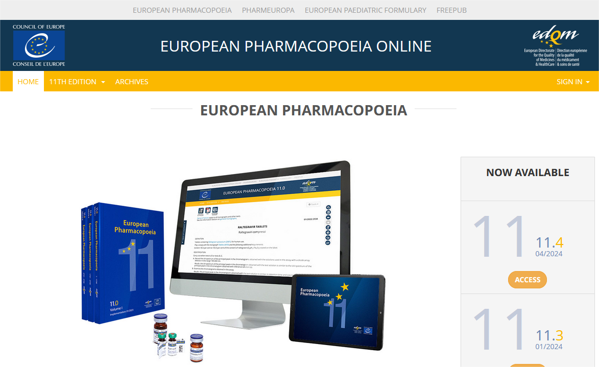 欧洲药典在线查询页面提供对欧洲药典电子版的访问。提供英文版和法文电子版。鉴于操作系统、浏览器和语言的广泛性,在使用环境中,EDQM 不对 HTML 格式的 Ph. Eur. 的任何渲染负责,电子版造成的不同于印刷版和 PDF 版的差异,请以PDF格式为准。