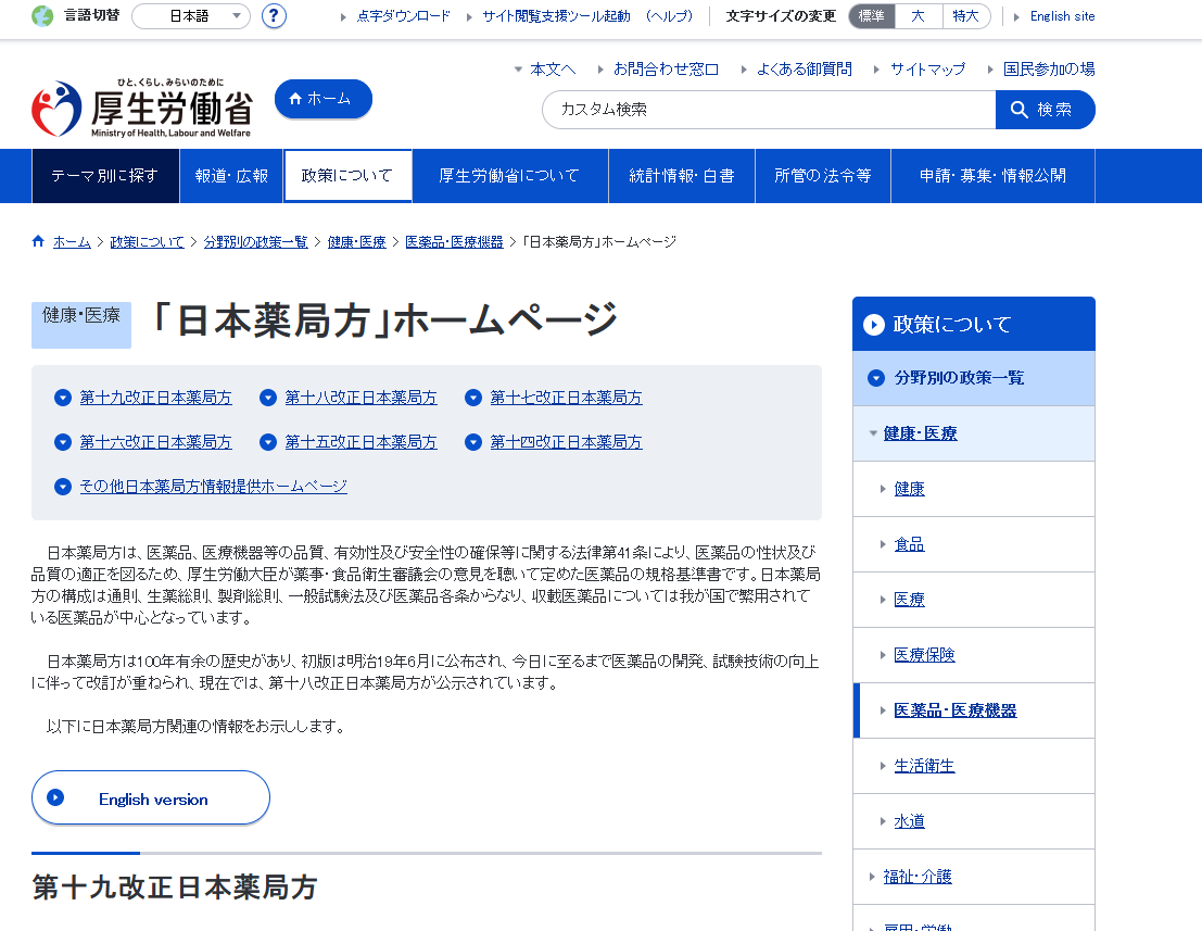 日本药典可在厚生劳动省官网的政策板块进行在线查询及PDF下载,包含19次修订版内容。
