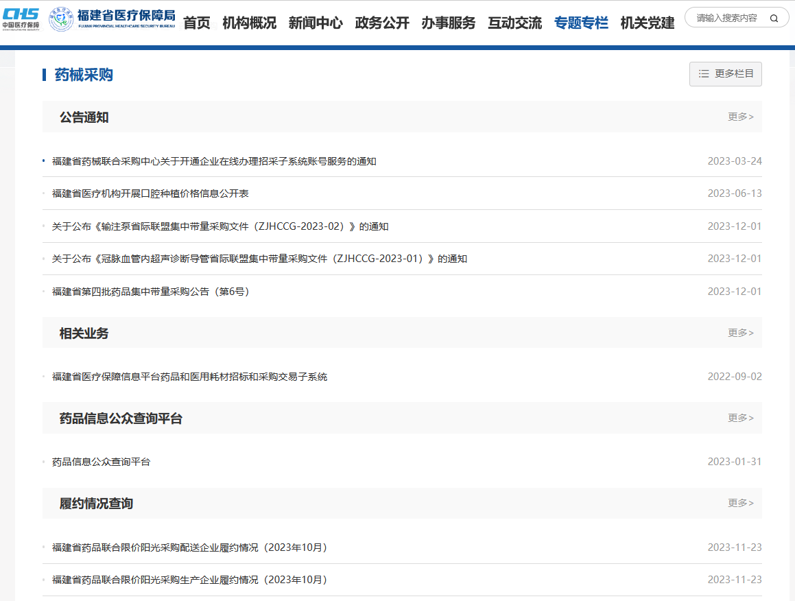 福建省医疗保障局提供药械采购公告通知、相关业务、药品信息公众查询、履约情况等信息查询。