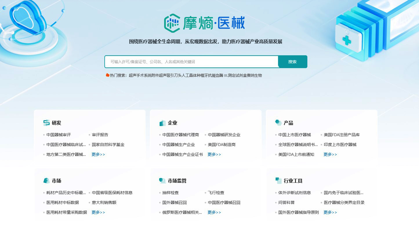 摩熵医械是一个专注于医疗器械行业的数据服务平台,旗下的医械数据库是目前国内医疗器械信息收载最为全面的一个数据库。它提供了全面且权威的医疗器械数据,以及便捷且连通的交互式数据检索工具。