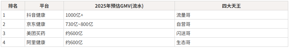 ①各平台GMV(流水): 抖音大健康> 京东健康 > 美团买药 > 阿里健康