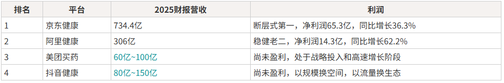 ②各平台营收: 京东健康 > 阿里健康 > 美团买药 > 抖音医药