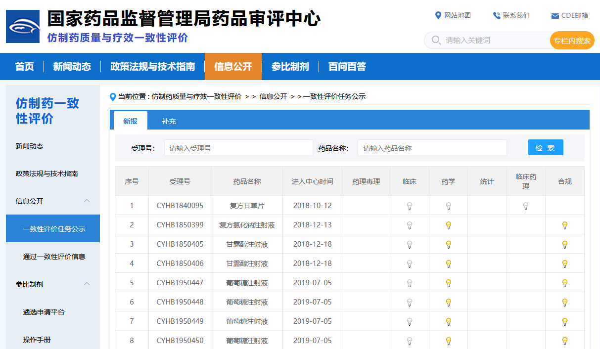 国家药监局药品审评中心仿制药质量与疗效一致性评价数据信息平台提供新报、补充的一致性评价查询。